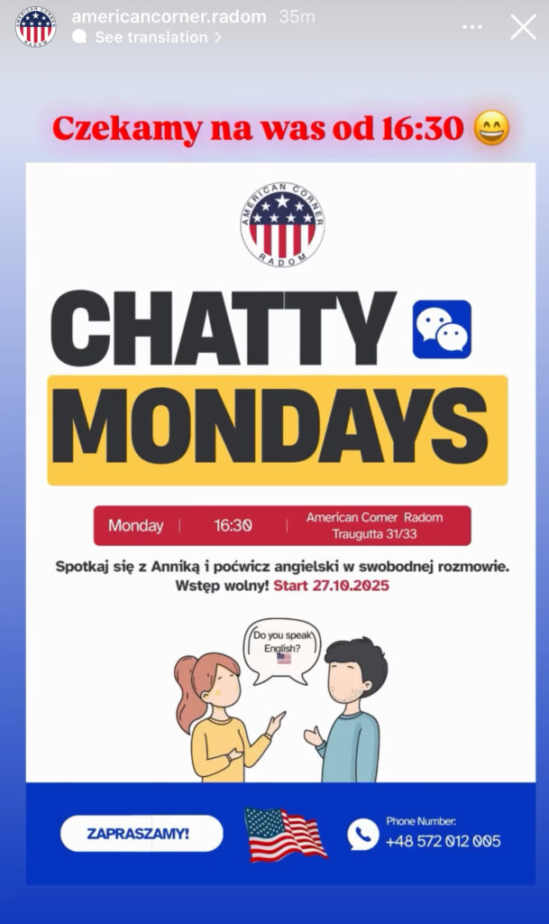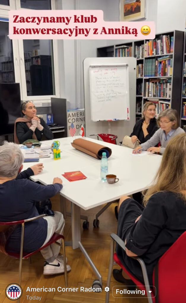 The American Corner is an institute to foster cooperation and exchange between Poland and the USA. Thanks to Ula and Karolina of the American Club in Radom for this opportunity to engage with the community. Thanks as well to everyone who joined!