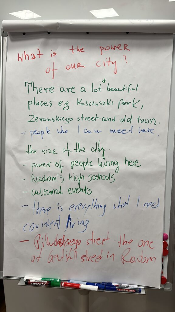 Everyone took turns going up to the writing poster board and adding their thoughts about what they felt were the strengths of the city, while we also had a conversation about it.