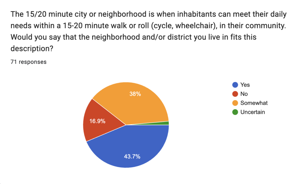 The survey, promoted with Living Streets Edinburgh, was designed as a 15-minute city residential survey that allowed for reflection and analysis of the availability of diverse amenities and services in local neighborhoods and the effects of such proximity on quality of life.