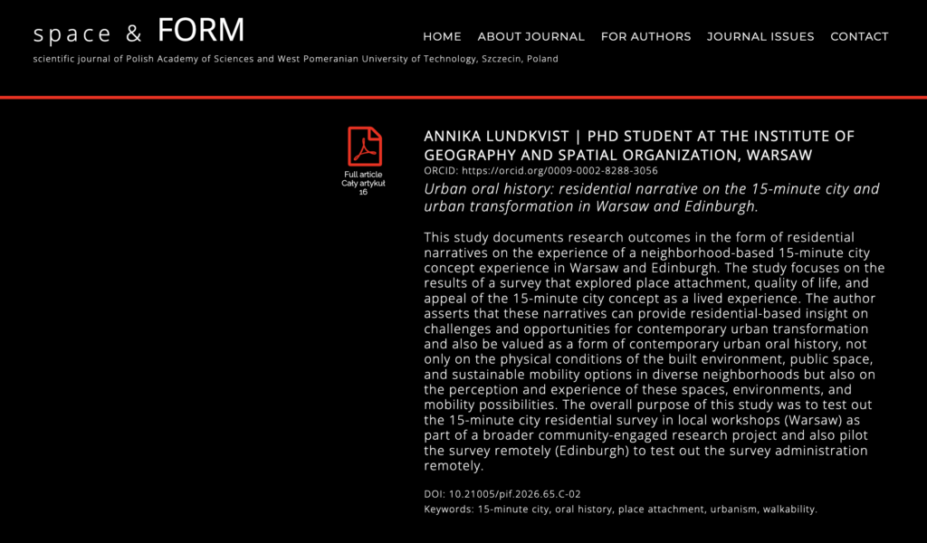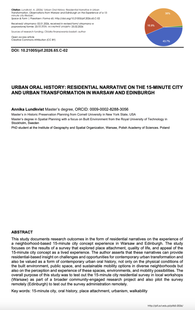 This research first appeared in the paper Urban oral history: residential narrative on the 15-minute city and urban transformation in Warsaw and Edinburgh in Issue 65 of space & FORM journal. Access here: https://pif.zut.edu.pl/pif65-2026/