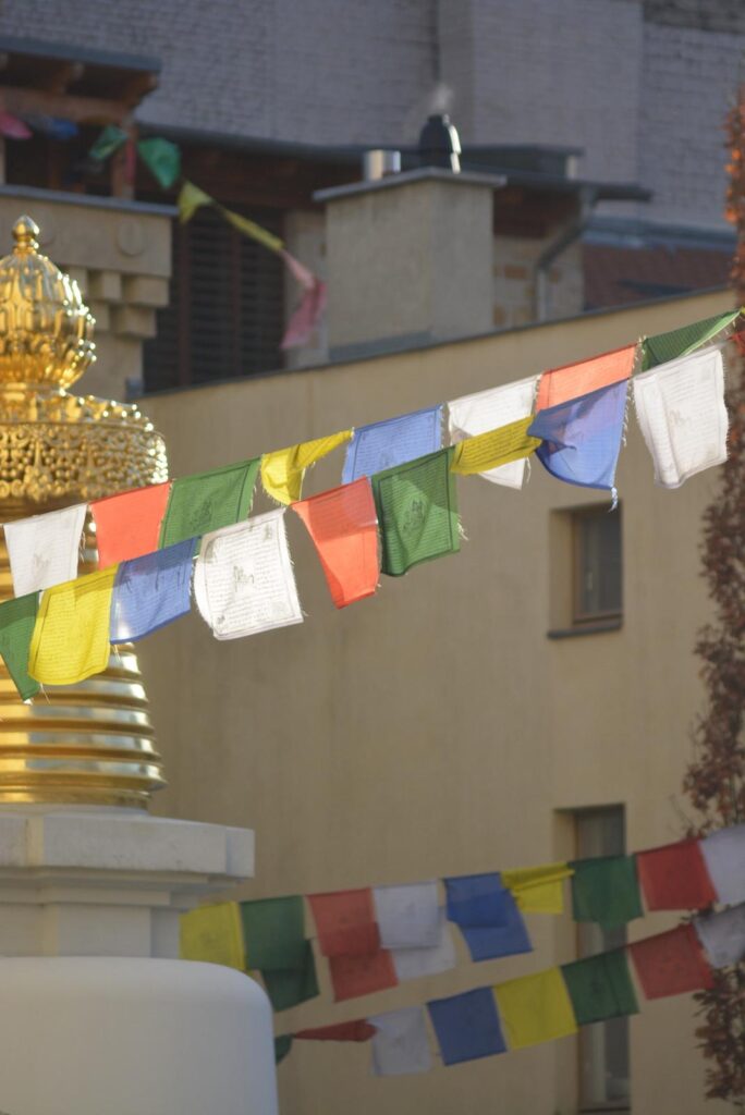 I photographed the scene below while visiting Bodhicharya Berlin – Buddhistisches Zentrum in November 2019. I toured the space of the Center with the architect who had designed it. Ialso had my two children with me (2 and 5 years old at the time). As I sat by the stupa in the chilly late November air and informally interviewed the resident architect, both of them napped bundled up by me in the stroller. Later, when we went into the spacious meditation room, my son gleefully took off his shoes and went quietly pouncing around the room with joy.