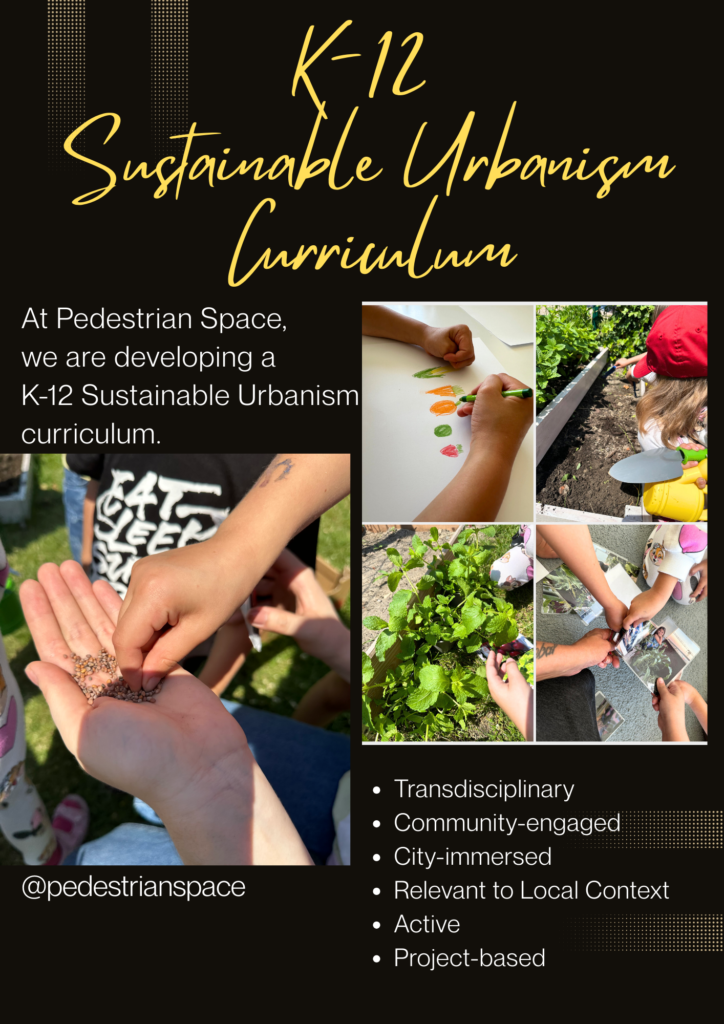My idea for a Pedestrian Space Sustainable Urbanism curriculum specifically connects to my reality as an urban researcher and founder of an NGO that is committed to media, public awareness-shaping, and education on diverse issues of urban resilience. Operating at the intersection of media, research, education, and advocacy is the raison d’être of Pedestrian Space. Synthesizing these areas into a coherent program, designed by age group modules and with a transdisciplinary, active, and project-based learning approach, is at the heart of the design for this curriculum. The curriculum is meant to serve as extracurricular and/or supplement the teachers’ existing educational plans.
