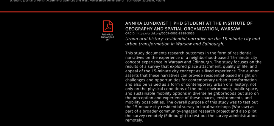 The paper is titled ‘Urban oral history: residential narrative on the 15-minute city and urban transformation in Warsaw and Edinburgh’ and connects to my PhD fieldwork through 2023 in Warsaw and a remote workshop I did in collaboration with Living Streets Edinburgh.