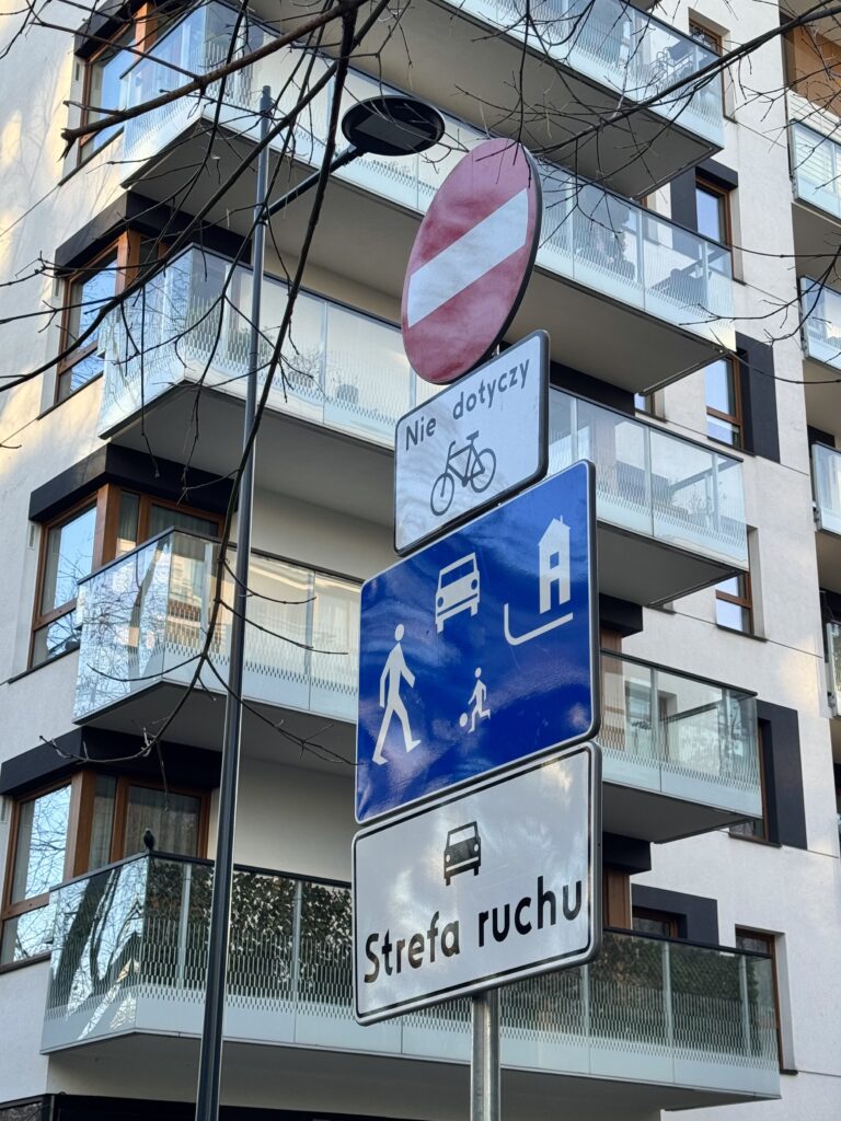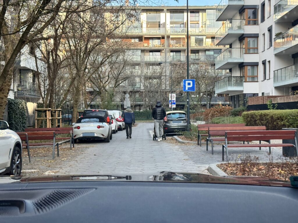 So what could be said about the new woonerf’s integration into the neighbourhood’s daily life? “A one- way street with a designated residential area. Pedestrians walking in the middle of the road have priority. Cars are parked in their proper places.” is how the council member, Łukasz Porębski, described the street in a Facebook post on the day it was opened. In another post, the District Office noted that “Calmed traffic and greenery make it not only a travel route, but a friendly space for everyday life in the district”. Is this what I observed? Partially yes, as the rich greenery and the urban furniture suggest a pleasant and people-focused zone hidden between the busier streets. However, the cars heavily lining the sides of the street, including in bays designated for pedestrians, as well as the serious traffic confusion caused by conflicting signs, create unsafe conditions for pedestrians and cyclists. One resident claimed on Facebook: “It’s said that the city isn’t building parking lots, but the “woonerf” that was opened two weeks ago, Brandysa Street, has already become a parking lot. Twice as many cars park there as there are designated spaces, and this is supposedly a “residential zone”.” In response to another comment pointing out the violations of the one-way street direction, the council member simply replied “They will learn.” Well, one month later — they didn’t.