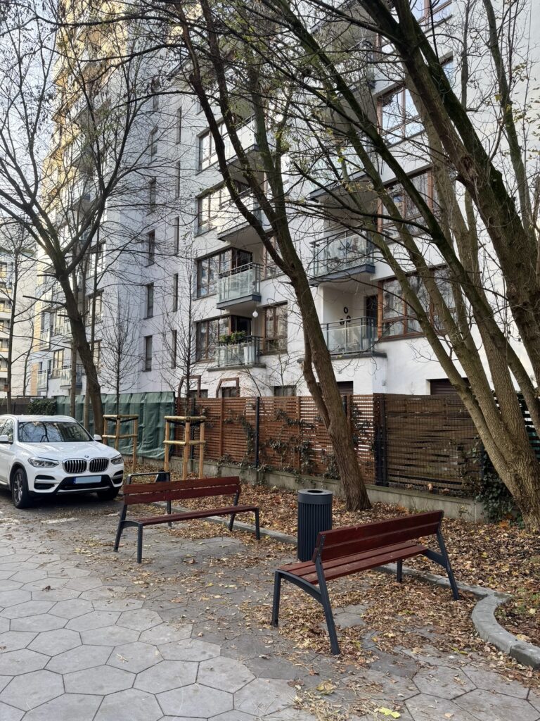 Shortly after arriving in Warsaw, I headed to Brandysa street in the Żoliborz district to see how this new woonerf was integrating into the neighbourhood’s life. What I encountered was a calm and newly renovated space, with new benches, bike racks, and very rich and pleasant greenery.