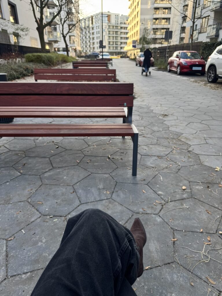 As my internship at Pedestrian Space is coming to an end, I am reflecting on the first field notes I had the opportunity to write back in September, over two months ago. Shortly after arriving in Warsaw, I headed to Brandysa street in the Żoliborz district to see how this new woonerf was integrating into the neighbourhood’s life. What I encountered was a calm and newly renovated space, with new benches, bike racks, and very rich and pleasant greenery. I observed many people using the space confidently, walking in the middle of the street, stopping, using the benches occasionally. By chatting with some local residents, I found out that the area was pleasant and functional.