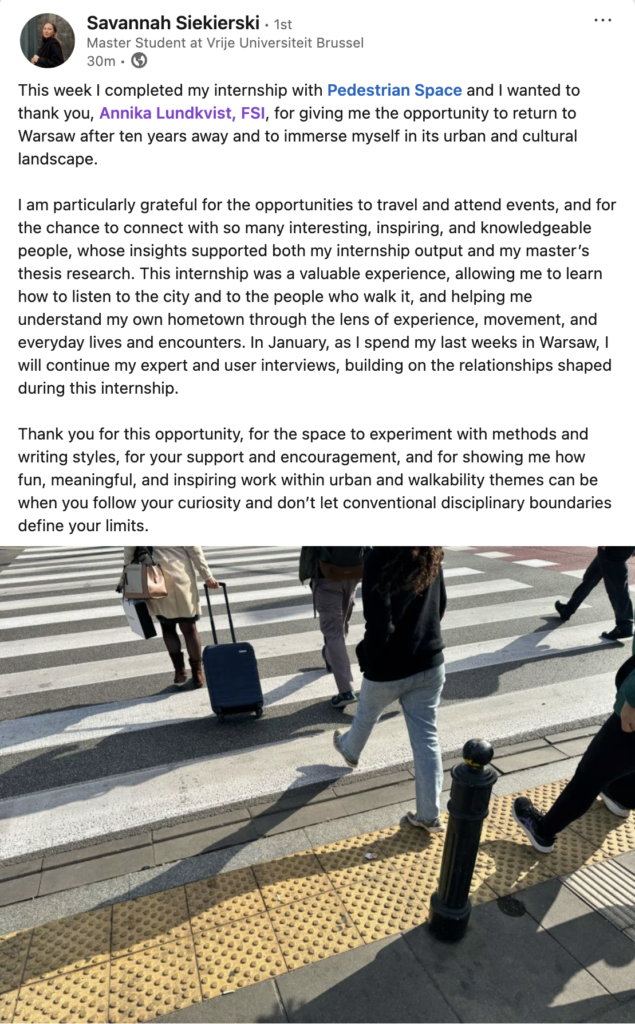 Savannah Siekierski, what an honor it has been to host you for your internship at Pedestrian Space! I really value what you have done during your internship and it’s also been fascinating to hear about your ‘return to Warsaw’ in a personal sense within the more formal context of doing your research there as well. Congratulations on work beautifully and very thoughtfully done! -Annika